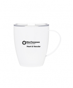 12 oz double wall 18/8 stainless steel thermal mug with copper vacuum insulation, clear acrylic push-on lid, and matching swivel; Hand wash recommended; Do not microwave; 4-7/16" h x 4"w (4-7/8 with handle) ; 355mL.