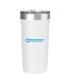 18 oz double wall 18/8 stainless steel thermal tumbler with vacuum insulation, brushed stainless steel rim, clear push-on acrylic lid with sliding closure, and powder coated finish. Hand wash recommended. Do not microwave. Complies with FDA, Prop 65. 7.25" H x 3.5" W