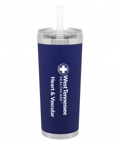 24 oz double wall 18/8 stainless steel thermal tumbler with copper vacuum insulation, stainless steel rim and base, threaded Eastman Tritan lid, snap closure, straw opening, and flexible wide silicone straw.