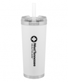 24 oz double wall 18/8 stainless steel thermal tumbler with copper vacuum insulation, stainless steel rim and base, threaded Eastman Tritan lid, snap closure, straw opening, and flexible wide silicone straw.